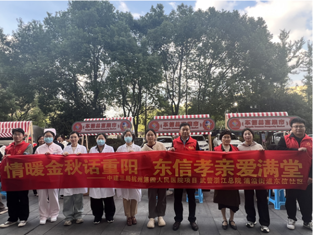 金秋送爽,丹桂飘香。10月23日,在重阳佳节来临之际,为大力弘扬中华民族尊老、敬老、爱老、助老的传统美德,丰富周边社区老年居民的精神文化生活,中建三局杭州四院项目积极履行社会责任,联合武警浙江总院与浦沿街道东信社区等单位,开展“情暖金秋话重阳 东信孝亲爱满堂”为主题的重阳节系列敬老活动。